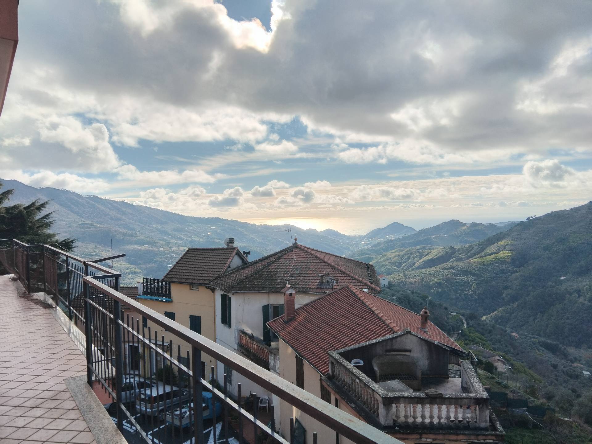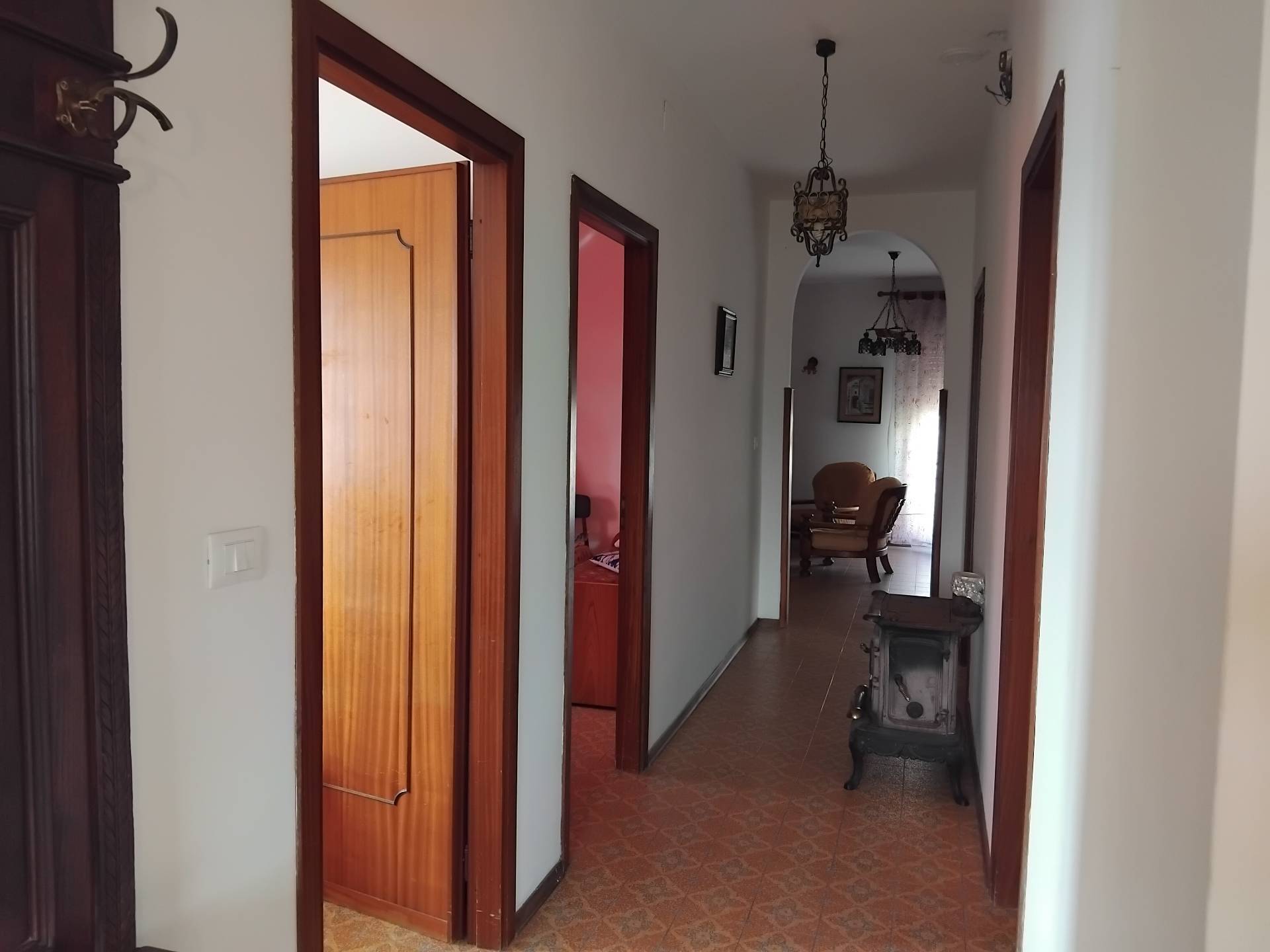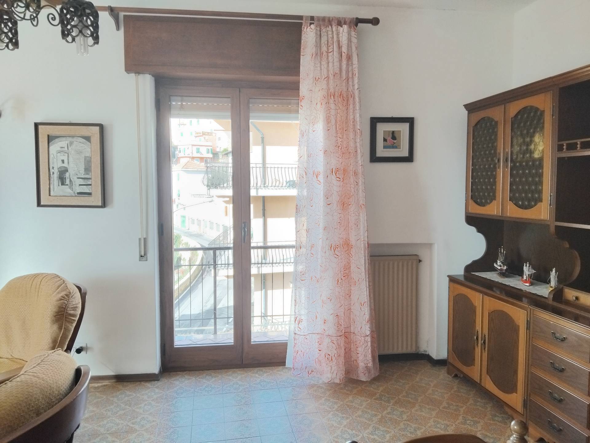 Appartamento su un livello, piano rialzato, ingresso indipendente, balcone che circonda gran parte dell'Appartamento, esposizione sud/ovest, vista mare e monti, anni 60, corridoio centrale , 2 grandi camere da letto, grande soggiorno con caminetto, cucina separata, bagno e ripostiglio spazioso, tutte le stanze con finestra. Entrata con scala e balconcino vista monti e mare, in paese, vicino ai servizi. Riscaldamento con caldaia a gas.